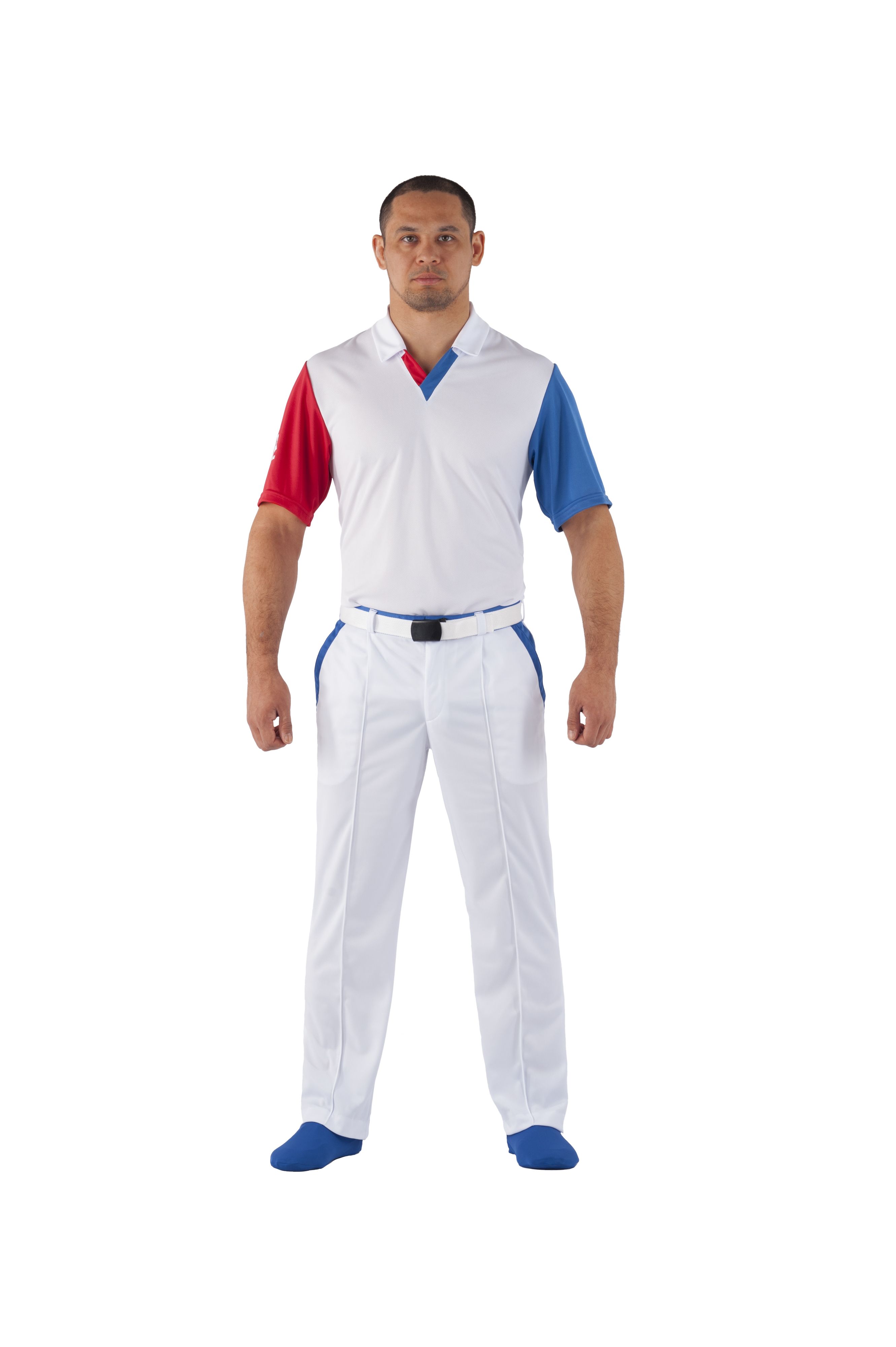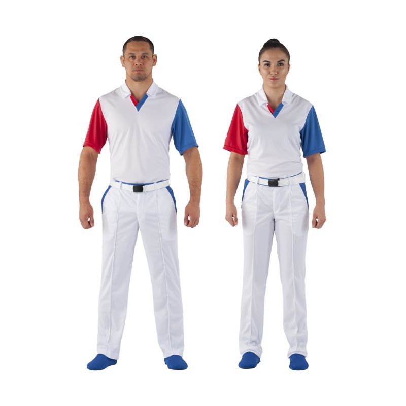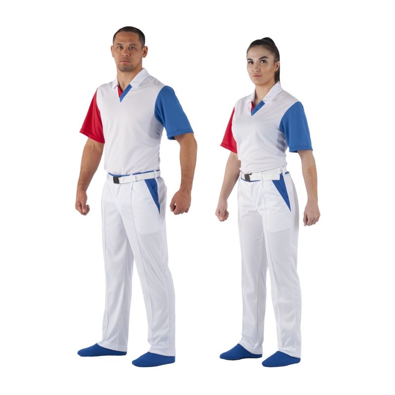 На спине надпись Referee (судья). Рукава короткие втачные синий и красный. Брюки белые с синими вставками.